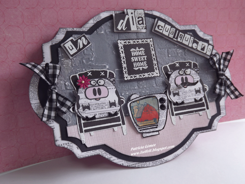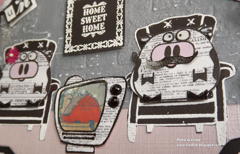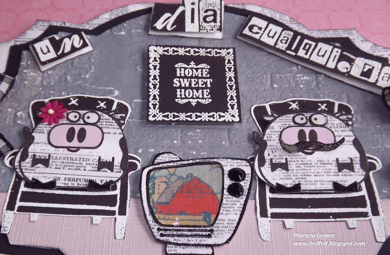 Sr. y Sra Vaca, son sellos de Paper Smooches, del set Chubby Chums, y la tele central, de la misma marca, es del set Boob Tubes. Los tres están realizados mediante paperpiecing del papel del periódico, y la tele además, lleva una imagen, imatando la programación de la tele, recubierta con glossy accents para dar efecto acristalado y de brillo. El Sr. Vaca luce un bigote que es un sello de Studio 112 Mustaches.