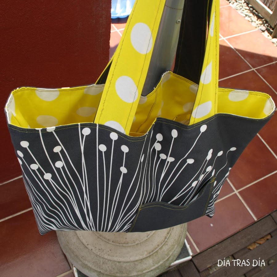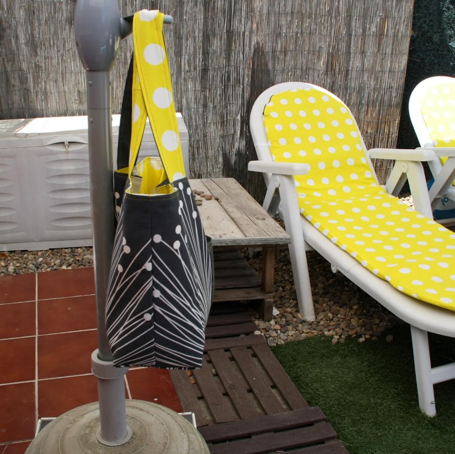 Y como me sobró un poquito de tela, decidí aprovecharla para hacer una bolsa para la playa, que realmente me hacía falta porque la que tenía hasta ahora estaba empezando a romperse. Y para hacerla he combinado esta tela con otra , también de Ikea, en tonos gris y blanco, y he hecho que la bolsa sea reversible. Así puedo usarla por el lado que prefiera en cada momento. Le he añadido en ambas caras un bolsillo y así tengo opción de guardar cosas tanto por una cara como por otra.