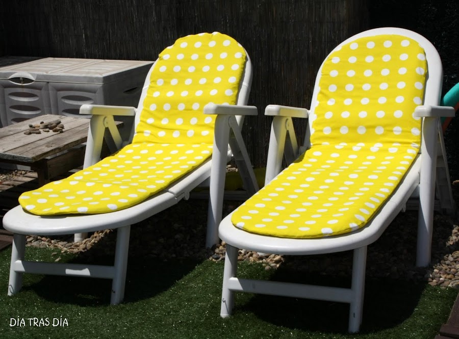 Lo que no tengo son fotos de los cojines antes de forrarlos, no caí en hacerlas para ver la diferencia. Eran los típicos cojines de franjas en color azul y blanco. Yo creo que así han quedado muy acordes con la época estival.