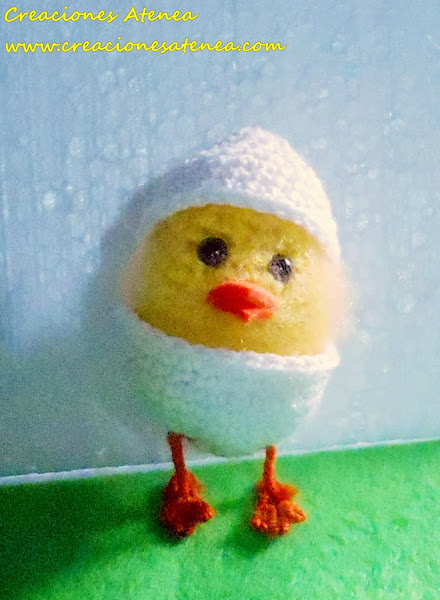 Acaba de salir del cascarón. El pico es de fieltro, le he pasado un cepillo para mascotas para que parezca que tiene plumón, y las patitas son de alambre forrado con lana naranja.
