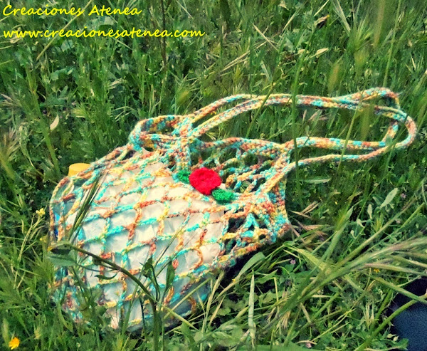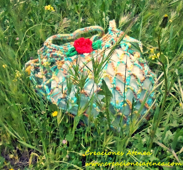 Es un pequeño solar, como muchos que hay por la zona, donde tal vez en algún momento se proyectó construir algo, y la recesión y la crisis del ladrillo lo impidieron, dejando un pequeño oasis en mitad de la ciudad, ideal para que una servidora tome el sol, se haga la ilusión de haber sido teletransportada al campo, y de paso saque unas fotos a este bolso de malla que hice, o bolsa para ir al mercado, que su creadora llama bolsa mandala: