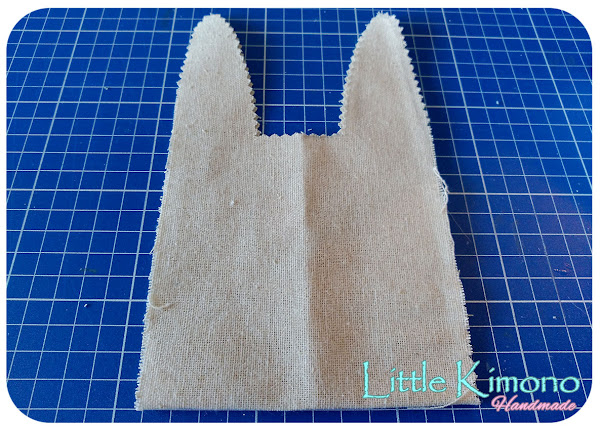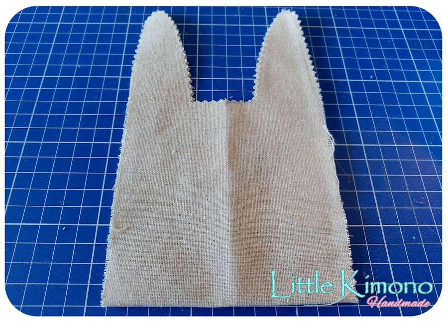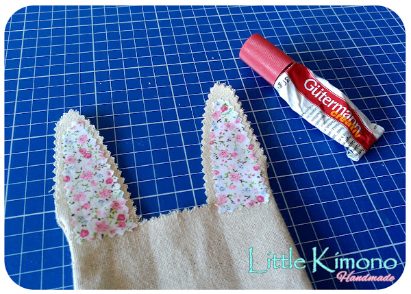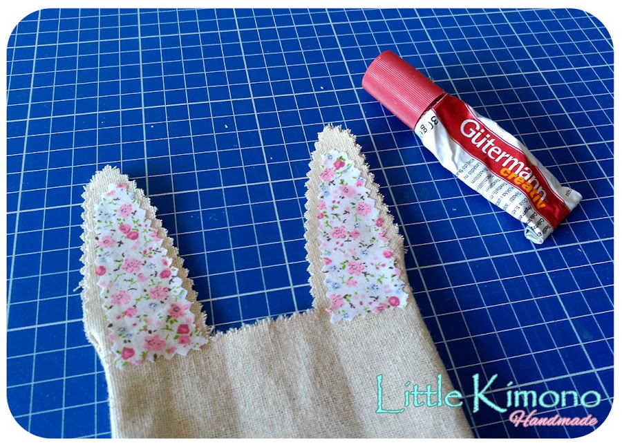 6. Y con la tela estampada cortamos dos piezas para colocar en las orejas, podemos usar pegamento textil.
