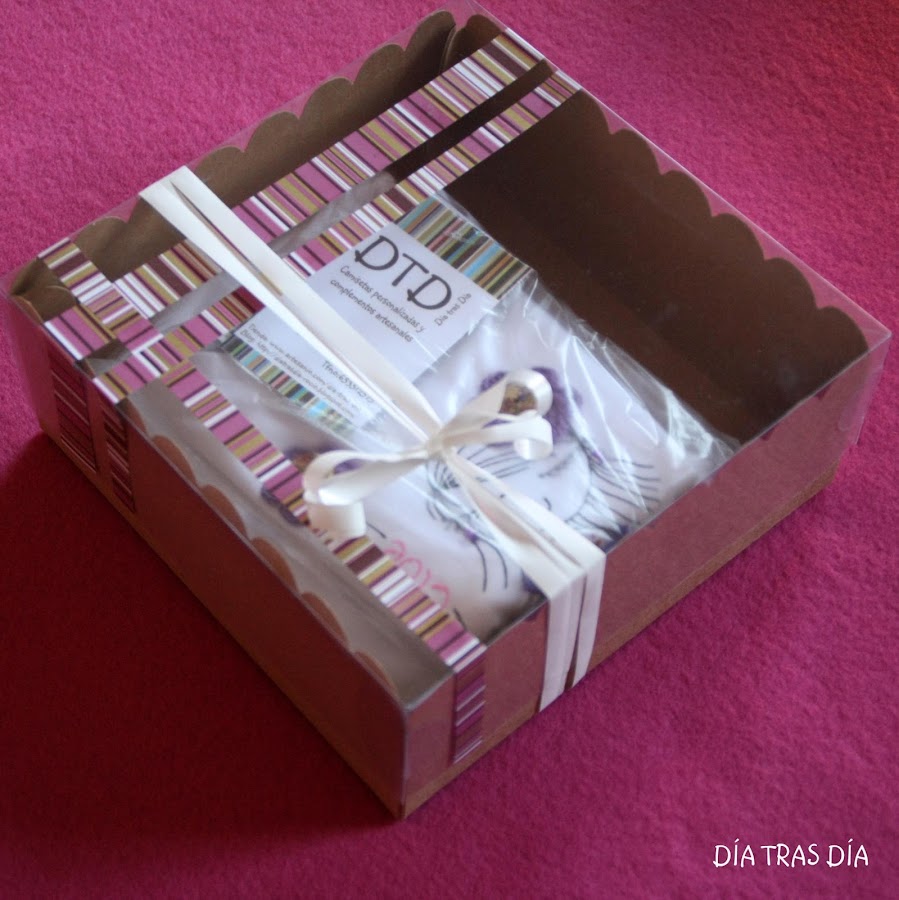Y como se trataba de un regalo de cumpleaños, le envié a Mónica el paquete preparado para la ocasión. Aquí os dejo una foto del empaquetado, que decoré con un pequeño detalle en tonos malvas y rosas, como la gama que había elegido para los complementos de Ro-ro: