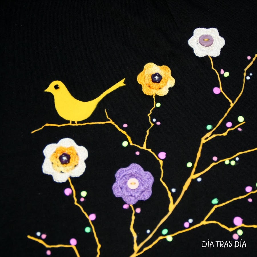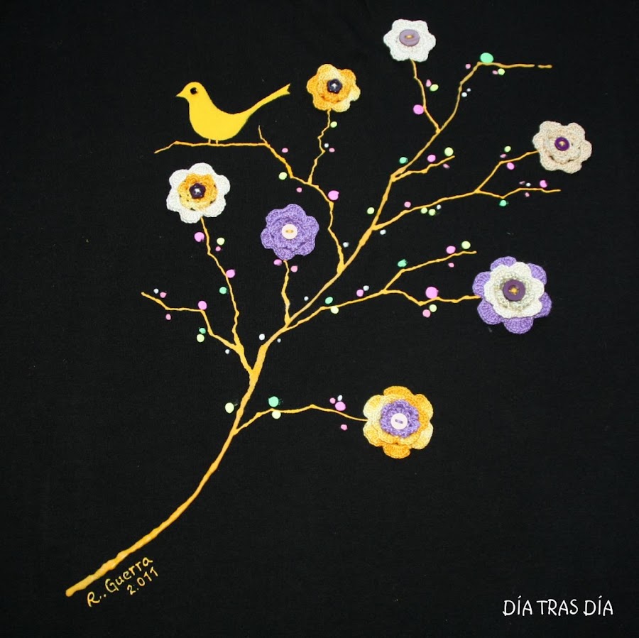 Bueno, pues como decía, que me voy por los Cerros de Úbeda, Raquel se puso en contacto conmigo para pedirme dos camisetas. Finalmente se decidió por una Ro-ro (en esta ocasión en versión marinera) sobre camiseta blanca de manga corta y por otra modelo "Árbol de primavera", sobre camiseta negra de manga larga.