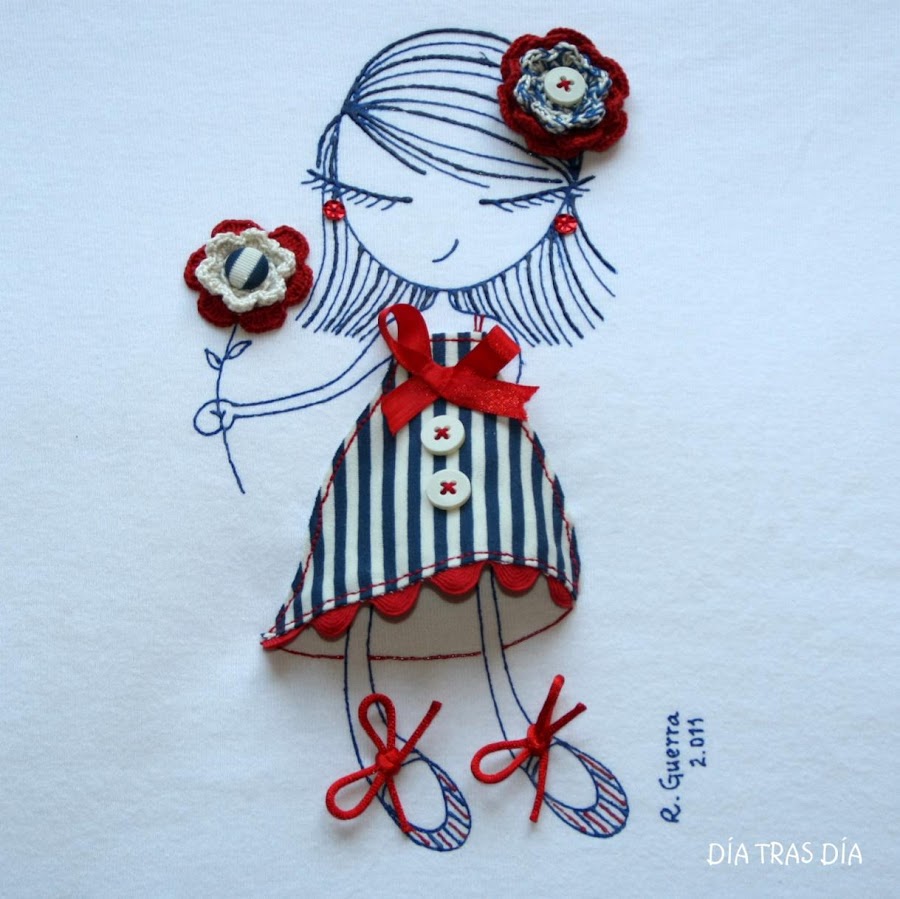 Se trata de un encargo de dos camisetas, que es especial por la persona que me lo pidió. Se trata de una chica a la que había conocido a través de la red, en mis múltiples paseos por blogs de artesanas. En realidad, debo dar las gracias a Nuria, mi hermana (El armario de pulguita), que fue quien la descubrió y a partir de ahí me hice seguidora de su blog. Si podéis echar un ratito, no os perdáis el blog de Raquel, que se llama El Mundo de Raquel, porque tiene unos complementos realizados con fieltro y con fimo muy originales.
