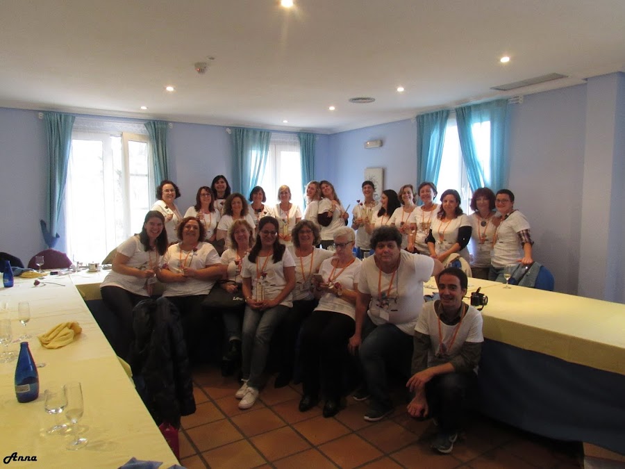 Hubo tiempo para intercambio de regalos, como una especie de amigo invisible. ¡Y vaya nivel! Cada uno pudo llevarse su detalle como recuerdo de ese día, aparte de la preciosa rosa y marcapáginas que nos llevamos todas, de la mano de Victoria y Coral. Y como se ve, todos bien guapos con las camisetas que nos trajo Anna. ¡Vaya nervios cuando teníamos que abrir el regalo! ¿Quieres ver la caja maravillosa que me traje? Aquí la tienes, una preciosidad hecha con todo el cariño por Marisa ¡Gracias!