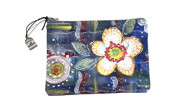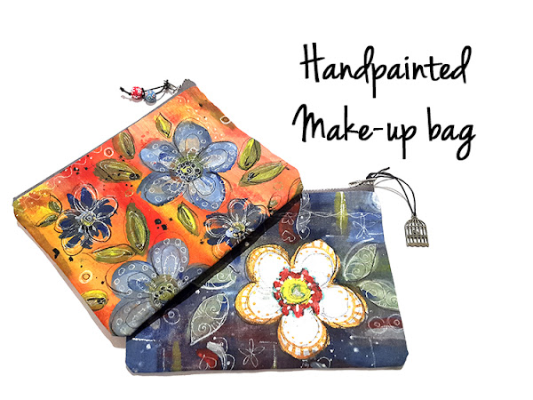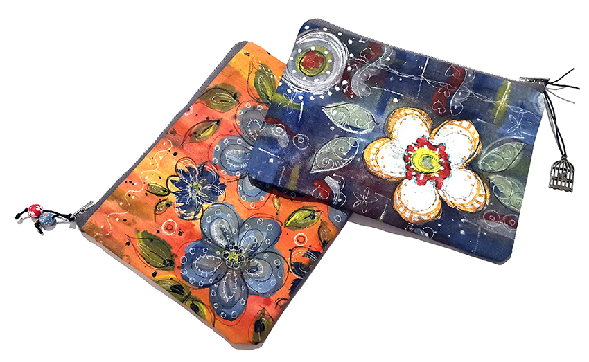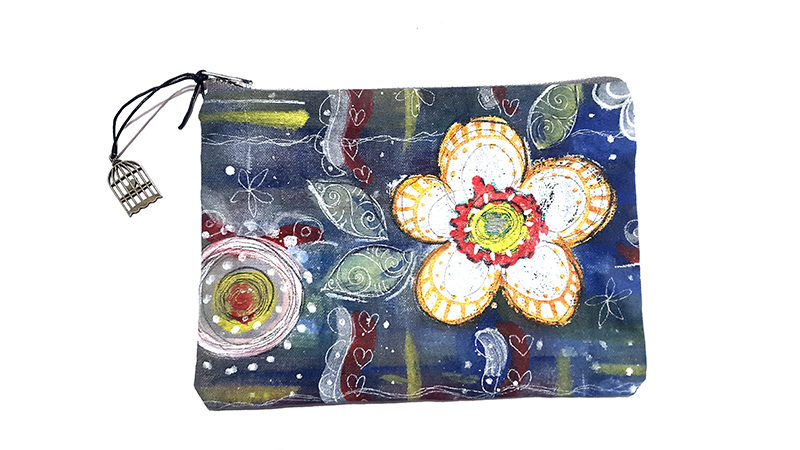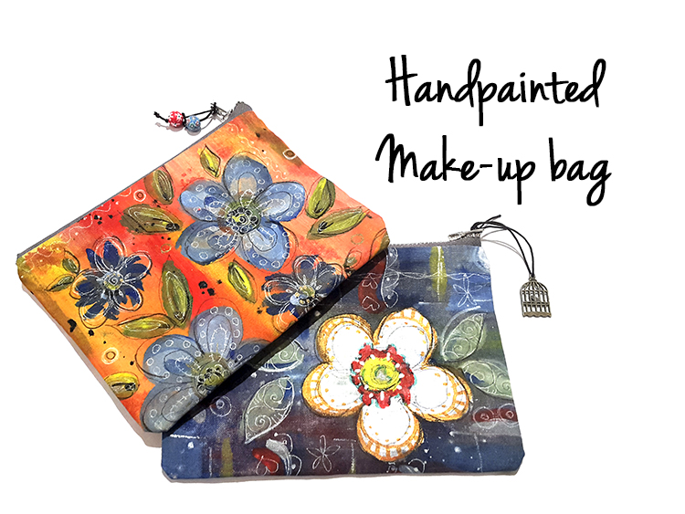 We have done two make-up bags, hand-painted. On top of cotton fabric, with the back plasticize; using acrylic paint that is resistant to water, we have made a drawing of ours. The fun of the acrylic paint is that it can work as the oil or tempera, doing layers and blending directly, and also quick-drying, which allows you to give touches with permanent markers, to contour drawing. This is the easy part.