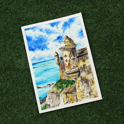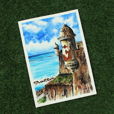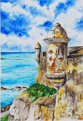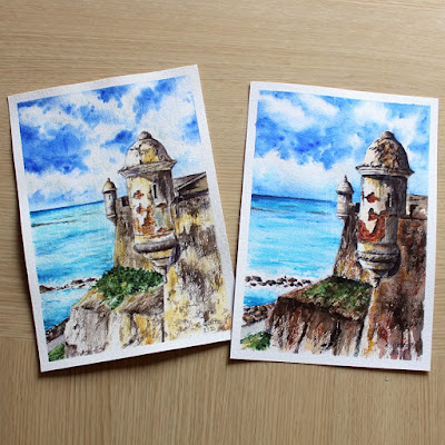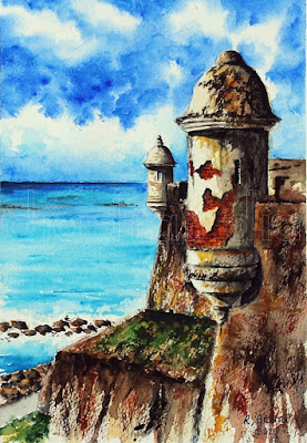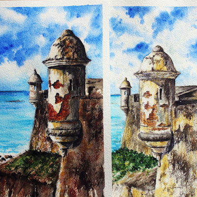 Se me ocurrió hacer el experimento con la primera de las acuarelas de este curso. El modelo a pintar era uno de los torreones del Fuerte de San Felipe, en San Juan de Puerto Rico.