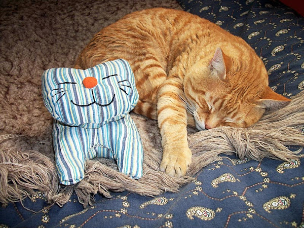 Para el gato no les tengo moldes ni tutorial, simplemente hice unos bocetos en carton de la cara el cuerpo y la cola, corté dos partes de cada uno , los cosí y los rellené, luego a mano, uní las partes, y le bordé la cara. Para los ratones los hice siguiendo las imagenes de este tutorial en inglés.
