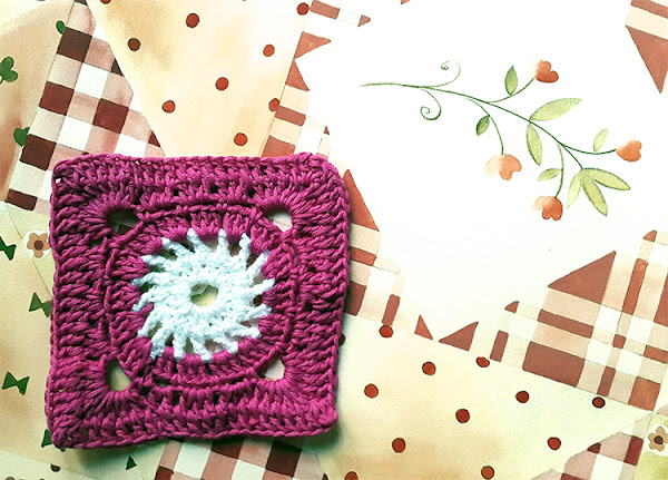 Sexta vuelta: 2 cadenetas + 14 puntos altos + 1 punto alto doble + 21 puntos altos + 1 punto alto doble + 21 puntos altos + 1 punto alto doble + 21 puntos altos + 1 punto alto doble + 6 puntos altos, unir con un punto deslizante y ya tenemos nuestro granny hecho.