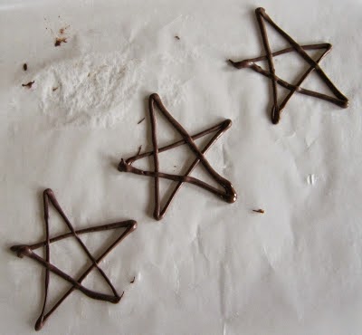 Para hacer las estrellas, colocamos un poco de chocolate ya derretido en una bolsita de plástico, hacemos un agujero en la punta, y arriba de un pedazo de papel de repostería, dibujamos estrellas.
