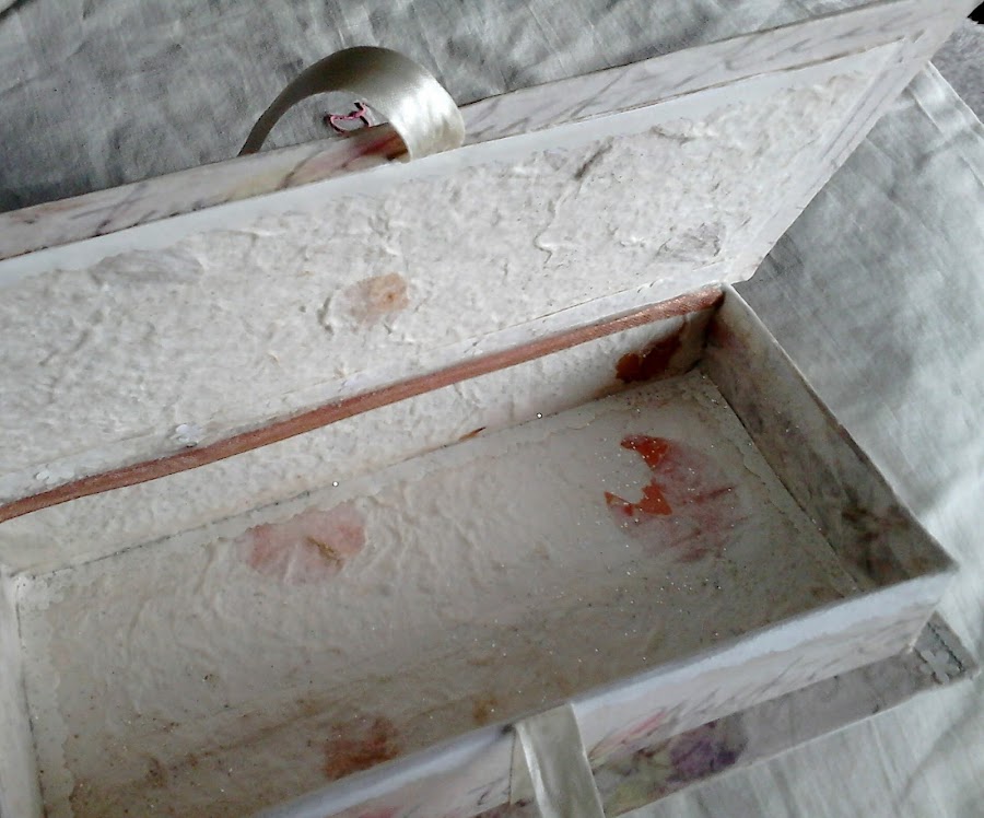Ambos lados de la tapa de joyero. En relieve, con puntillas y purpurina. Me gusta utilizar purpurina. Además de una piedra de cristal y una pequeña hada.