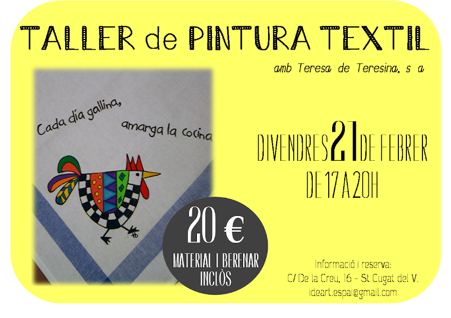 Ahhh, i si voleu aprendre a pintar sobre tèxtils des de cero i sou a la vora de Barcelona, el proper divendres 21 de febrer de 17 a 20h faré un taller. Començo la meva col·laboració amb la Cris d"Ideart, un espai de manualitats i tallers a Sant Cugat, molt a prop del Monestir.