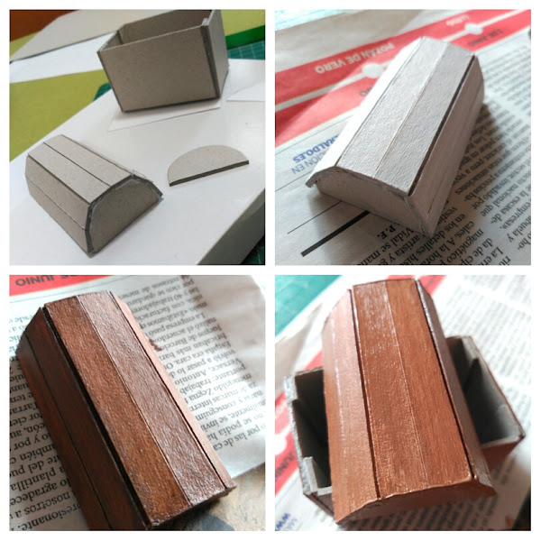 La tapa del cofre tiene muescas a modo de tablas de madera, de esa forma conseguimos doblar el cartón, que nos tiene que quedar de forma semicircular.
