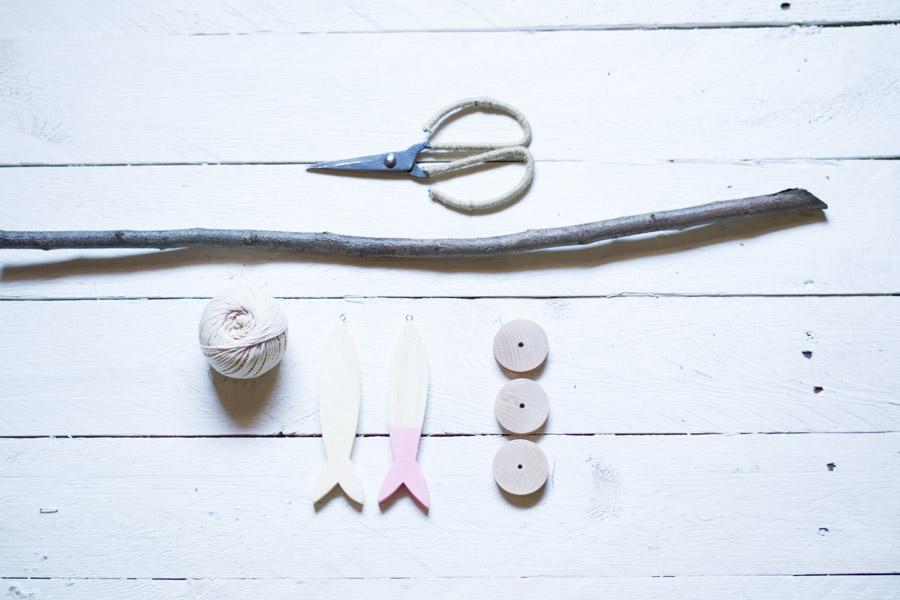 Materiales: Ramas o palos, cuerda fina de algodón, alcayatas, peces madera.