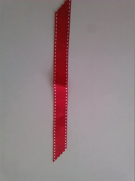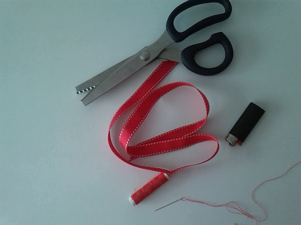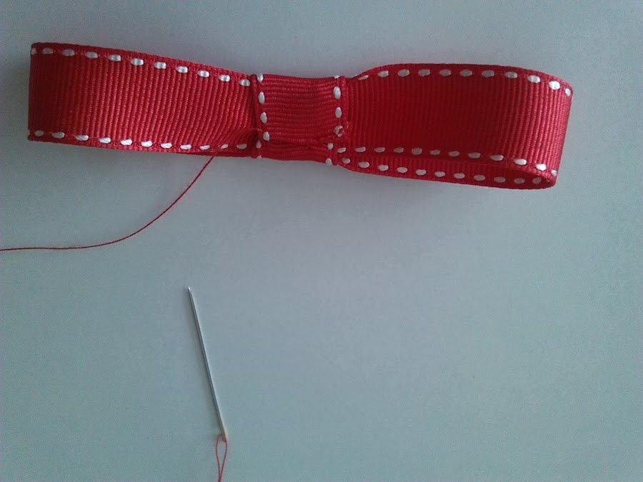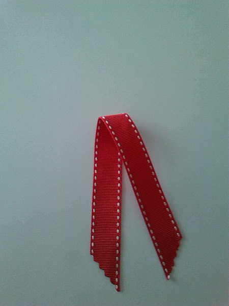 4º Para hacer los rabitos, cortamos un trozo de lazo con el mechero con mucho cuidado le quemamos los extremos para que no se deshilache. lo doblamos a la mitad, con un alfiler lo unimos al lazo y con una aguja lo cosemos al lazo.