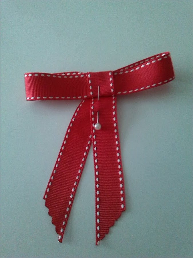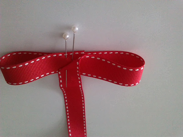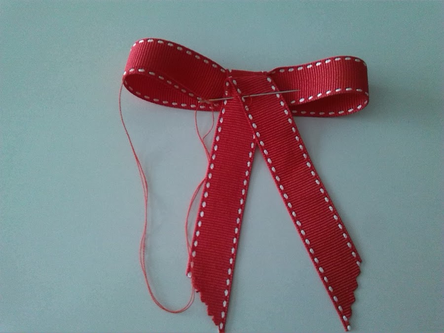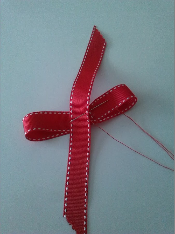 3º Una vez hecha el lazo, le damos una vuelta a las lazadas con el lazo sobrante, y lo fijamos con un alfiler. Con una aguja e hilo, cosemos el lazo, para que no se deshaga.