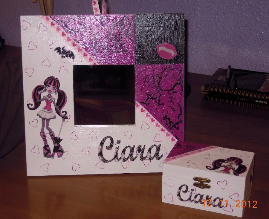 Este malma hace juego con la cajita de las monster , os aclaro , que los malmas son marcos de madera con espejo, por si le interesa a alguien , mide 26 X 26 y el espejito 10 X 10 ...
