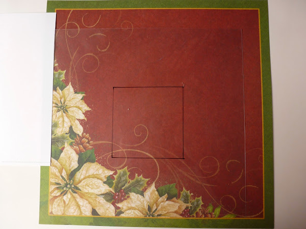 Os pongo otro ejemplo. El papel de abajo tiene las flores de Pascua a la izquierda, y está enmarcado con un borde dorado y verde. Si incluímos ese borde, sólo se verá en un ángulo. Pero si colocamos el acetato a partir del mismo (he puesto un papel blanco para que se vea donde empieza el acetato), vemos que utilizaremos todas las flores y el espejo no nos tapará el estampado.