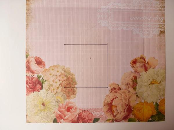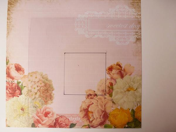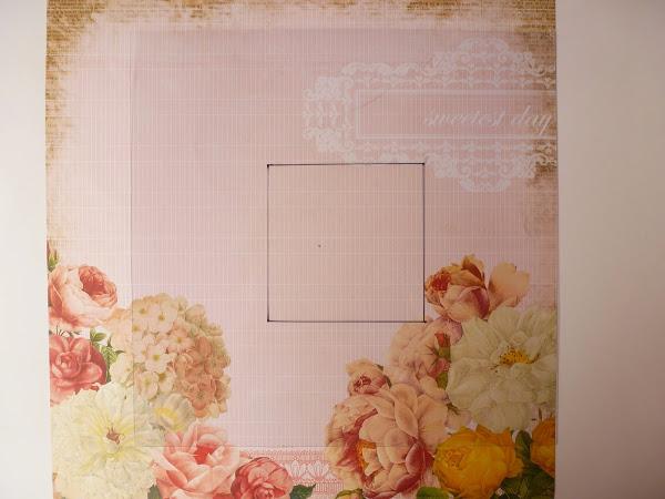 Sólo hay que colocar la plantilla sobre el papel, y moverla sobre él para buscar el encuadre más adecuado y que más nos guste. En el papel de la foto se ve que tiene flores a la derecha y a la izquierda, y una etiqueta con el mensaje "sweet day" arriba a la derecha. Tendremos que sacrificar parte de estos elementos, y moviendo el acetato podemos elegir.