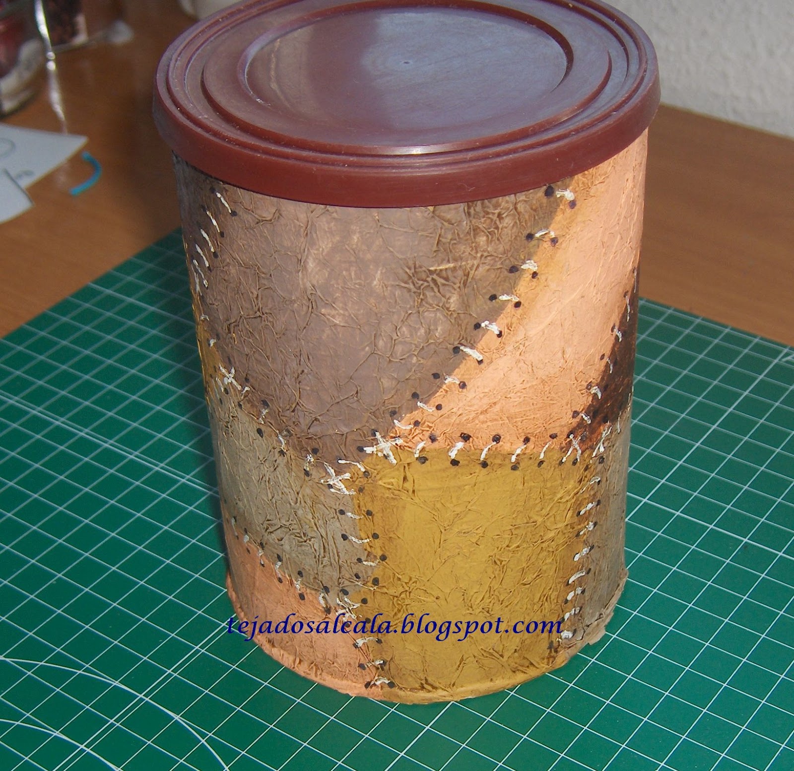 Es un bote de café tuneado con la técnica del falso cuero y ha quedado así.