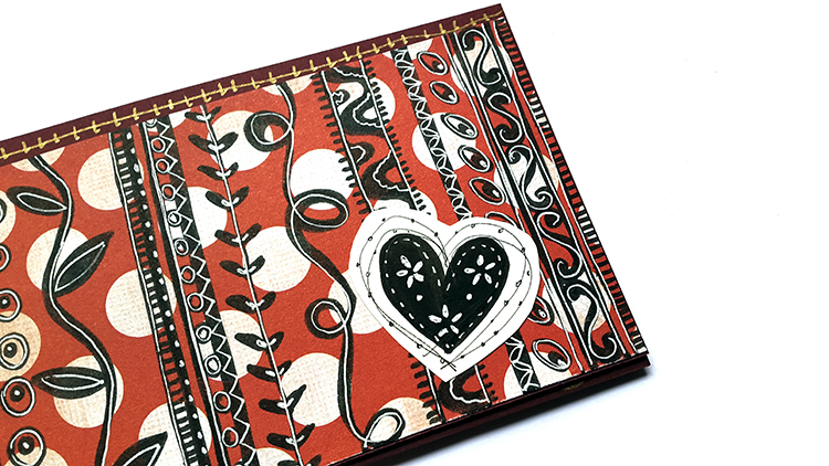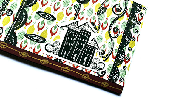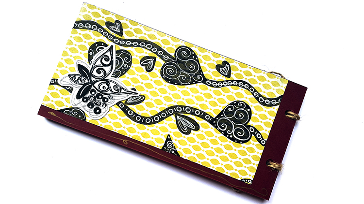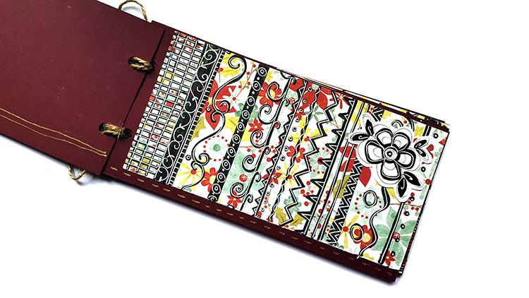 Sobre unos papeles decorados del cuaderno de papeles Mistletoe de KaiserCraft, que ya usamos anteriormente, hemos dibujado doodles. La medida de las hojas es 16’5cmX8’25cm; hemos usado la mitad de una hoja entera que es de 16’5cmX16’5cm; para las tapas hemos reciclado un dibujo antiguo hecho con acuarelas y rotuladores metalizados. Para hacer el soporte hemos usado cartulina de color granate, recortando 5 páginas de 18’5cmX9cm; dos son la portada y la contraportada y las otras tres las páginas, propiamente dichas. Hemos pegado, con celo de doble cara, los papeles decorados a las páginas y el dibujo reciclado a las tapas.