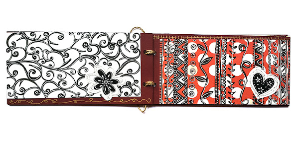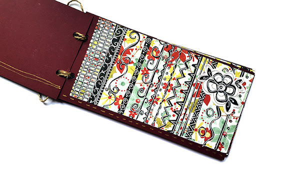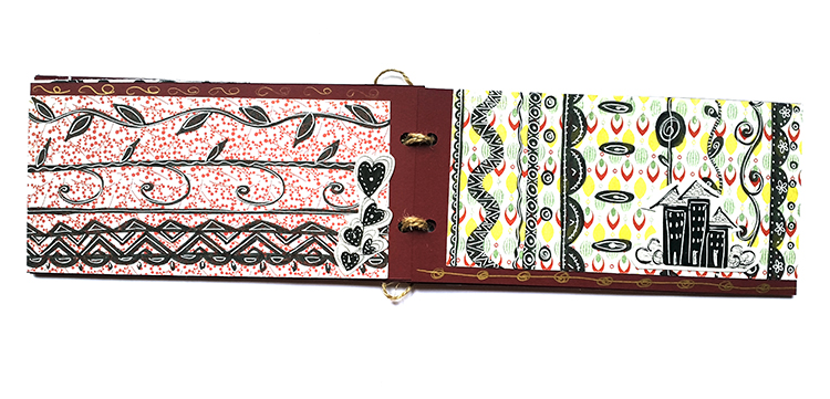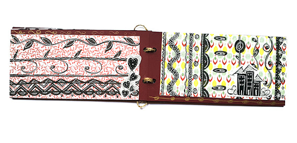 Over some decorated papers of notebook of papers "Mistletoe" by KaiserCraft, which we used before, weve drawn doodles. The extent of the sheets is 165cmX825cm; we have used half a whole sheet which is 165cmX165cm; for the cover weve recycled an old drawing made with watercolours and metallic pens. To make the support weve used garnet colour cardboard, cutting out 5 pages of 185cmX9cm; two of them are the cover and the back cover and the other three pages, properly said. We have stuck with double-sided tape, the decorated papers in the pages and the recycled drawing at the covers.