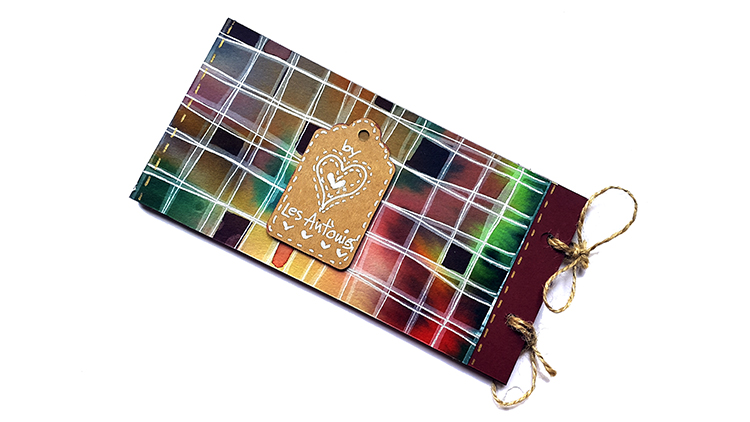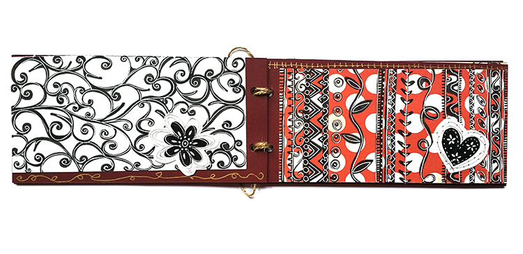 Damunt d’uns papers decorats del quadern de papers Mistletoe de KaiserCraft, que ja vàrem usar anteriorment, hem dibuixat doodles. La mesura dels fulls és 16’5cmX8’25cm; hem fet servir la meitat d’un full sencer que és de 16’5cmX16’5cm; per les tapes hem reciclat un dibuix antic fet amb aquarel·les i retoladors metal·litzats. Per fer el suport hem utilitzat cartolina de color granat, retallant 5 pàgines de 18’5cmX9cm; dues són la portada i la contraportada i les altres tres les pàgines, pròpiament dites. Hem enganxat, amb cel·lo de doble cara, els papers decorats a les pàgines i el dibuix reciclat a les tapes.