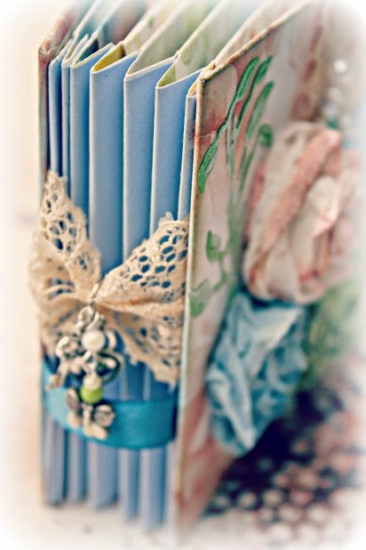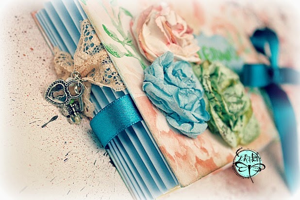 Es un mini con muchas posibilidades, escondites, bolsillos, etiquetas... yo he tomado unos papeles apastelados de Stamping up ("Farbenwunder") que me van como anillo al dedo. Los papeles le van muy bien a mis rosas, que ya tenia listas; recuerdan? hice un video mostrando cómo hacerlas, esta AQUI.