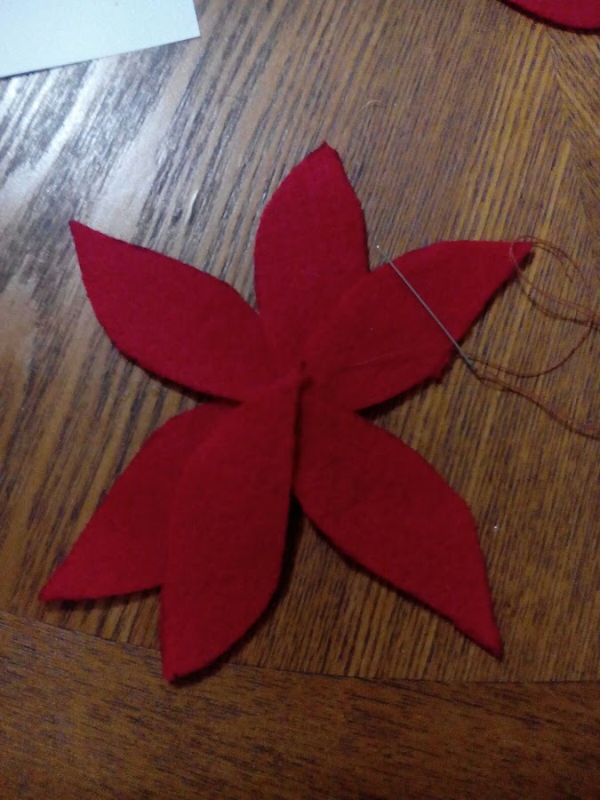 Previamente he dibujado en el fieltro pétalos para formar una flor de Pascua, 6 pétalos en total y los uní en el centro cosiendo con aguja e hilo rojo.