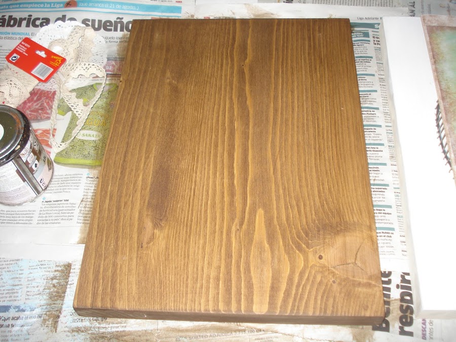 Aplicar bastante cola blanca sobre la imagen y colocar sobre la tabla.