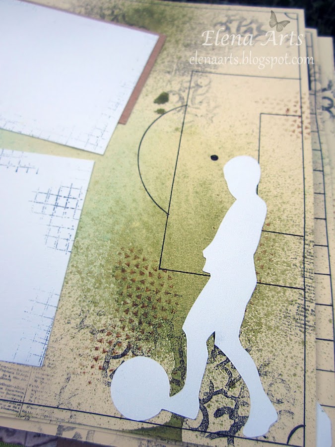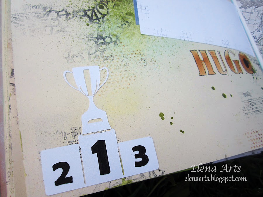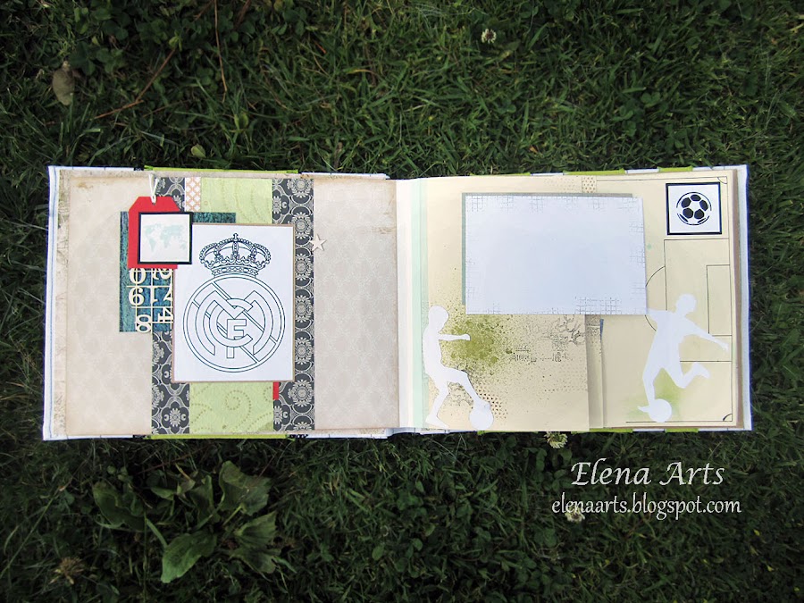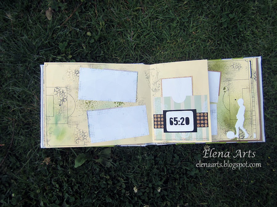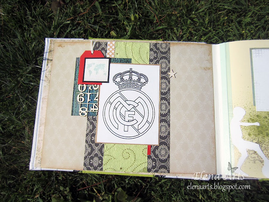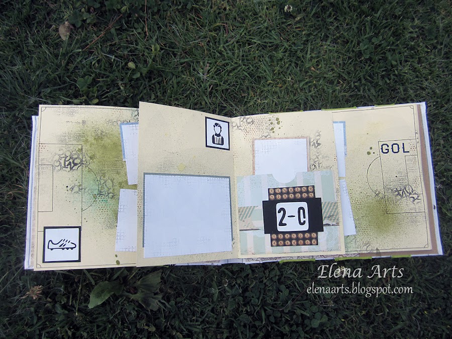 El fondo de las páginas lleva unos sellos estampados de números (los jugadores), flechitas (el movimiento del balón), texto (los medios de comunicación que retransmiten el partido), cronometro con el tiempo del partido, incluso el marcador que marca 2:0. En fin, tenemos UN PARTIDAZO!!!! Mucho movimiento y diversión!