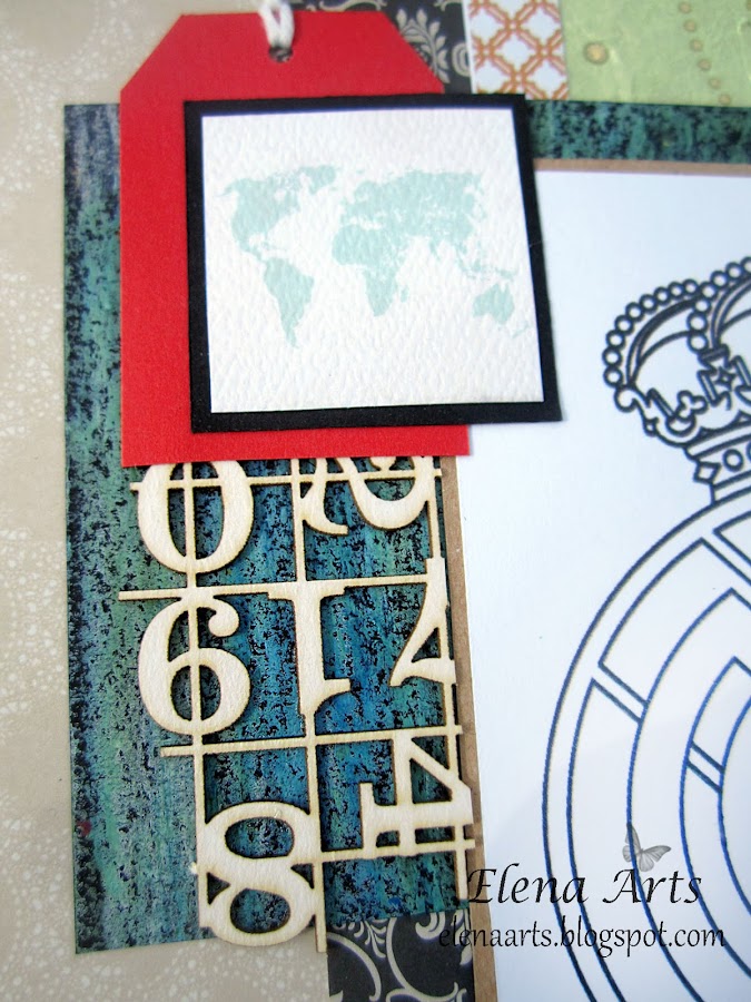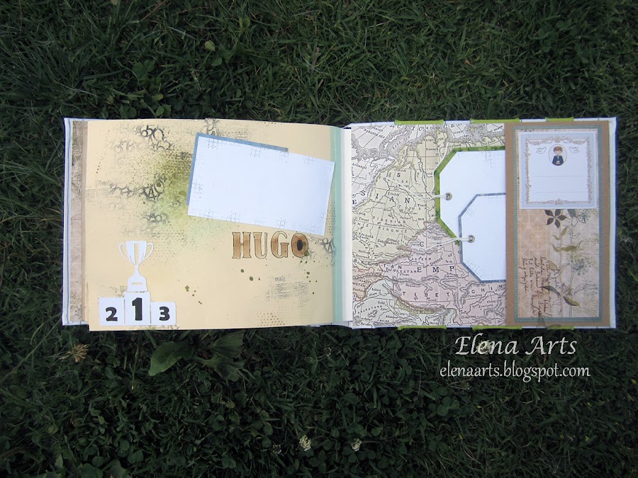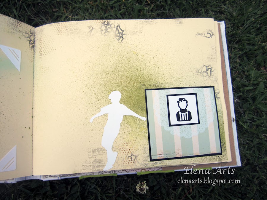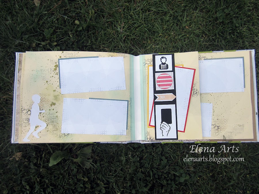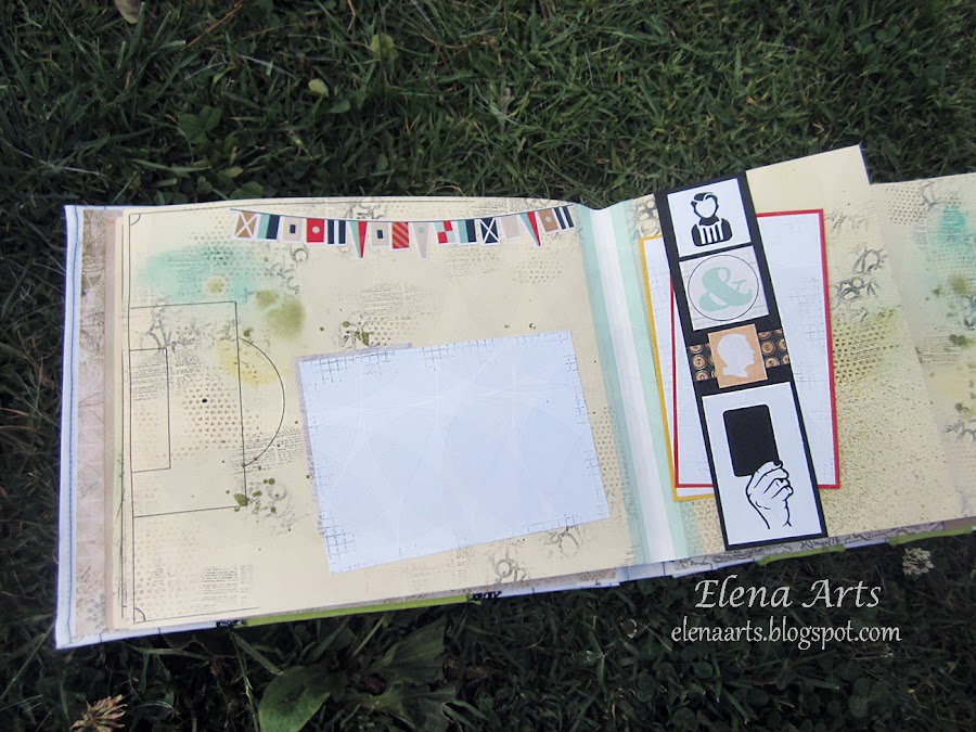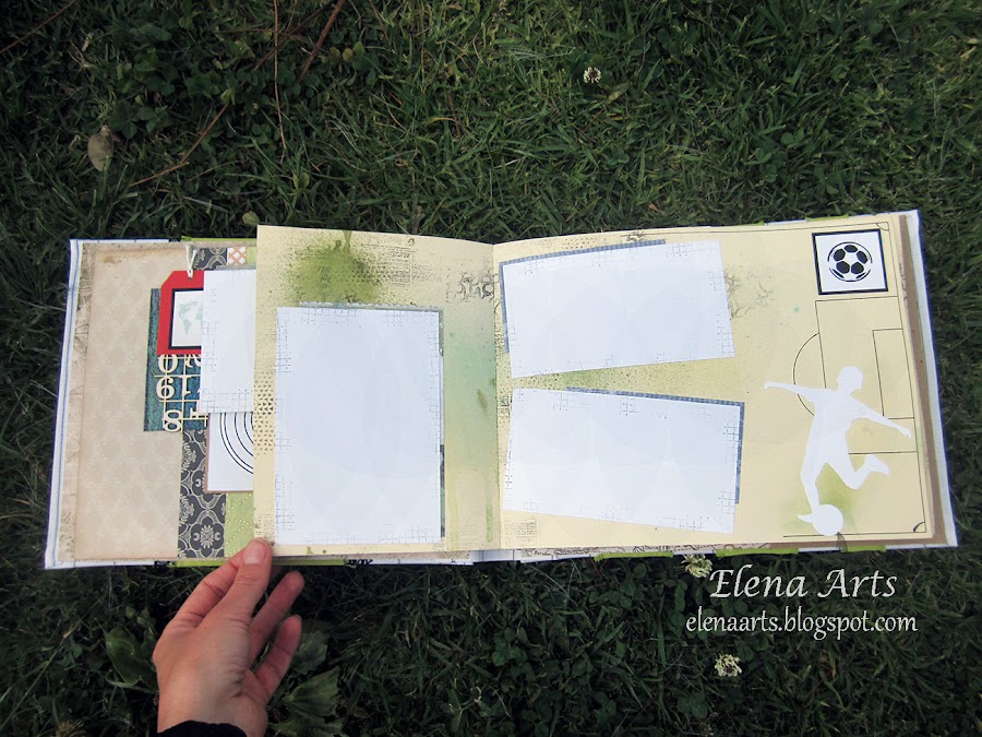 El fondo de las páginas lleva unos sellos estampados de números (los jugadores), flechitas (el movimiento del balón), texto (los medios de comunicación que retransmiten el partido), cronometro con el tiempo del partido, incluso el marcador que marca 2:0. En fin, tenemos UN PARTIDAZO!!!! Mucho movimiento y diversión!