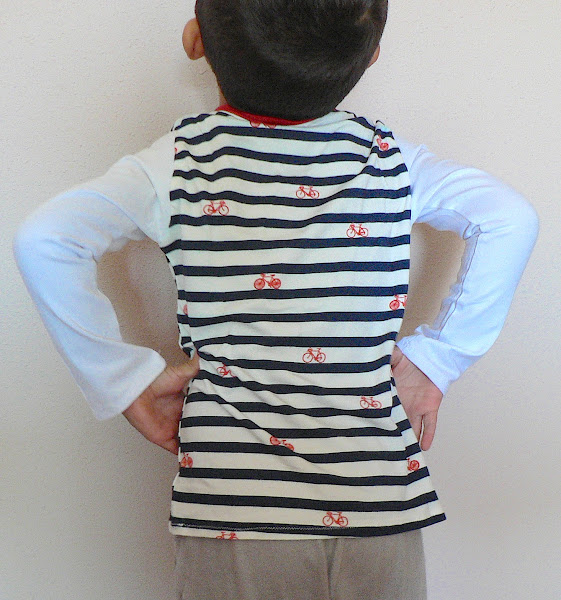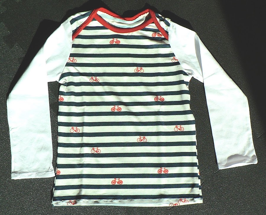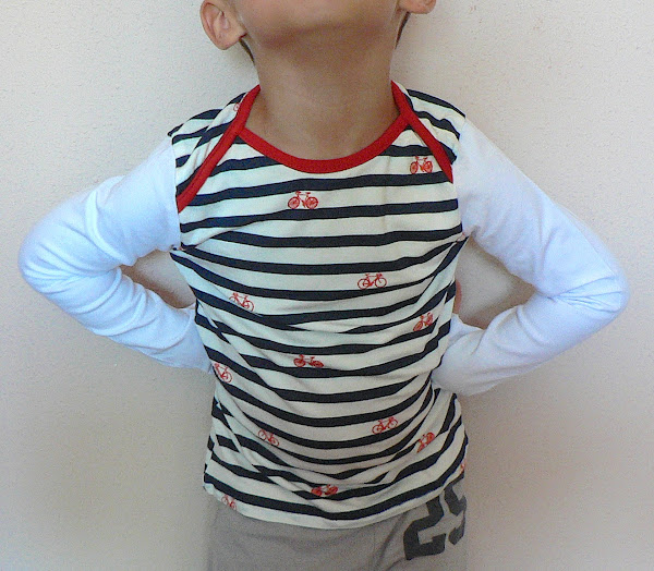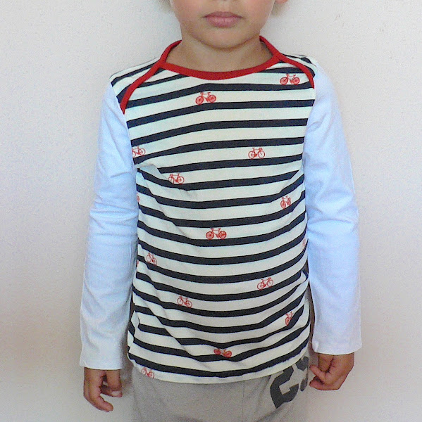 Pero a veces llegamos y conseguimos unas pocas para compartir con vosotros. Hoy os enseño el modelo Three Times T de la revista Ottobre Design 4/2015. Se trata de una camiseta de manga larga bastante sencilla, pero con un cuelo que imita los cuellos de los bodis. Y digo imita, porque es un cuello fijo, los laterales no quedan solapados, solo hace esa forma. A mi me ha resultado un cuello demasiado pequeño. No sé si es que lo he cosido mal o es que mi hijo es demasiado cabezón, pero por la cabeza le pasa justito.