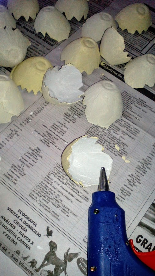 Cortamos la huevera de la manera que ves en la imagen y hacemos los picos para darle el aspecto de huevos.