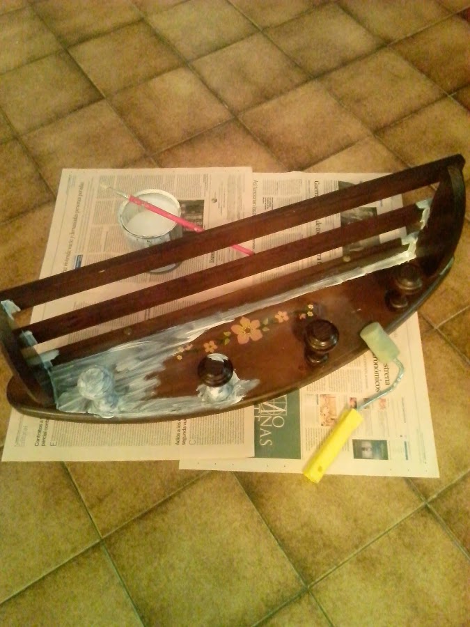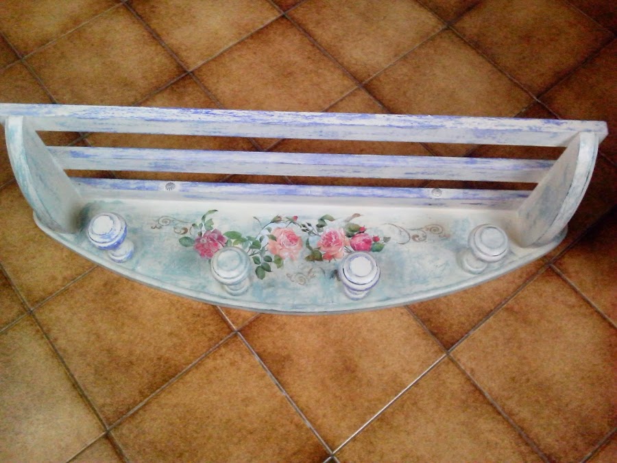 Un perchero al que tenia ganas de darle un aire nuevo, empecé por darle una capa de imprimación Una manita de pintura base...... Y otra mano de pintura color crema, dejé secar y le pasé una vela para conseguir un decapado lijando con mucho cuidado. Para acabar lo decoré con una servilleta con dibujos de unas rosas y stencil, una mano de barniz y...listo..