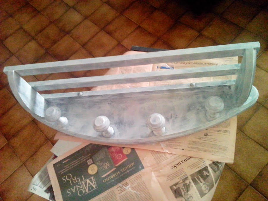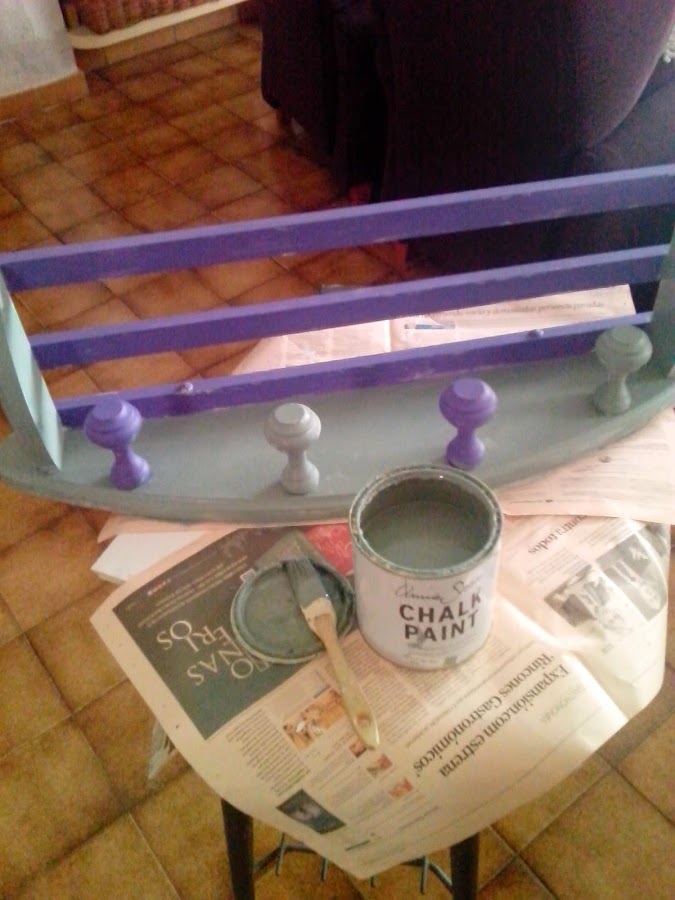 Inspirada por el colgador que nos enseñó Blanca de Dedal Oh! en una de sus últimas entradas, recordé que tenía dos amiguitos esperando a que les hiciese un lavado de cara...así que manos a la obra con el primero de ellos! Desatornillé los pomos y le dí una capa de Duck egg blue, de Annie Sloan. Me apetecía hacer algo con toque shabby y elegí esta servilleta, porque además los colores eran adecuado ...
