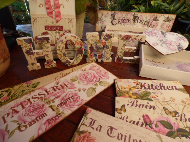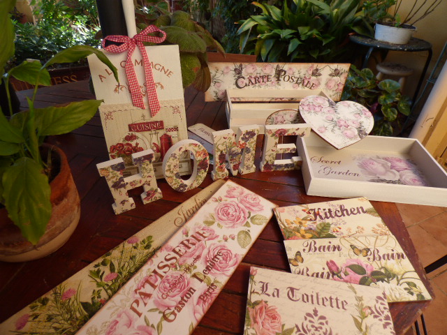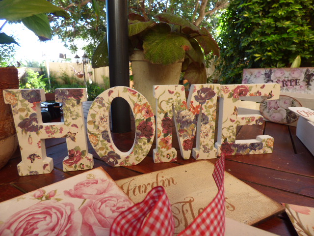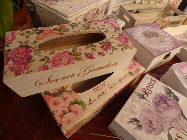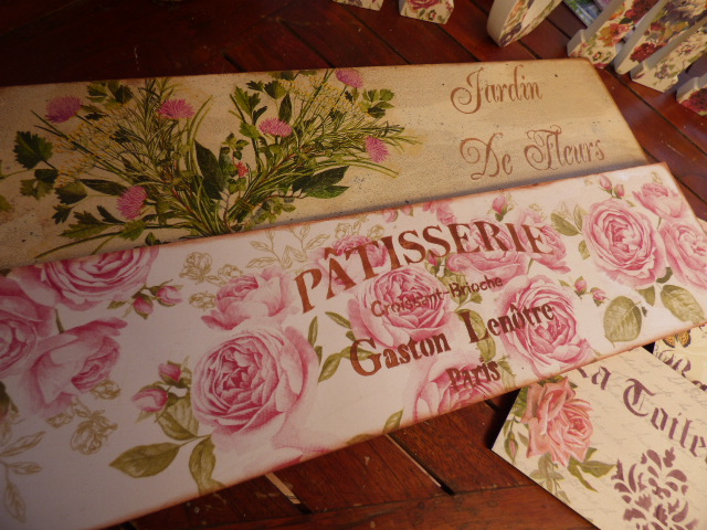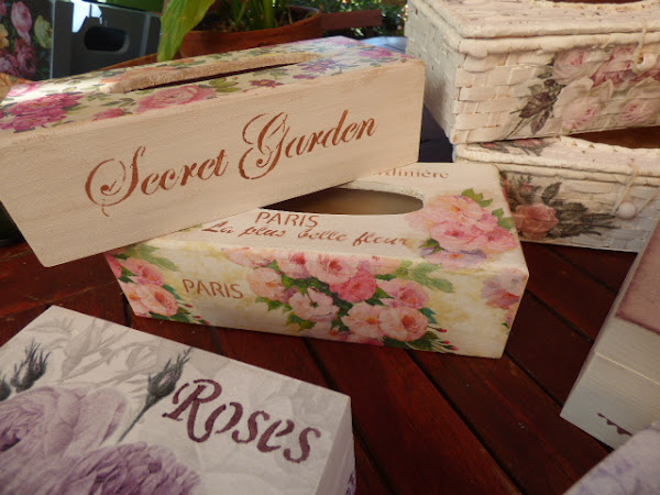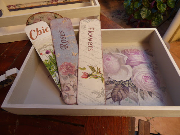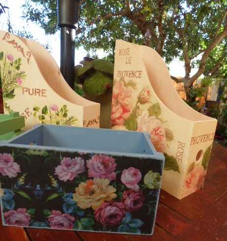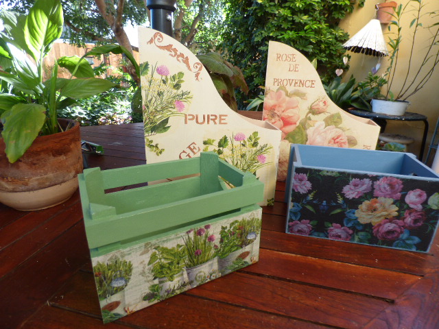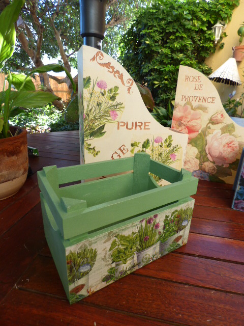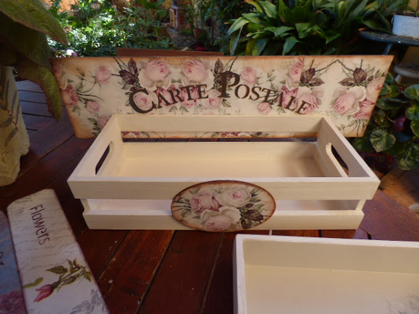 Con la cuarta cajita de este estilo que tenía, he hecho una especie de mini-jardinera o estantito para el correo, llaves etc.....poniéndole detrás pegado, un retal de madera, decorado, con su plaquita a juego. Igual repito este modelo con otros estampados.