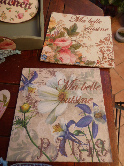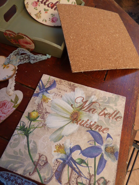 Compré estas placas de corcho para probar si quedaban bien con decoupage. Pintarlas cuesta lo suyo, llevan 2 o 3 capas de pintura blanca, luego cola, dejar secar y servilleta con la plancha.....eso la de tonos naranjas y verdes.