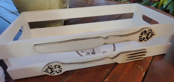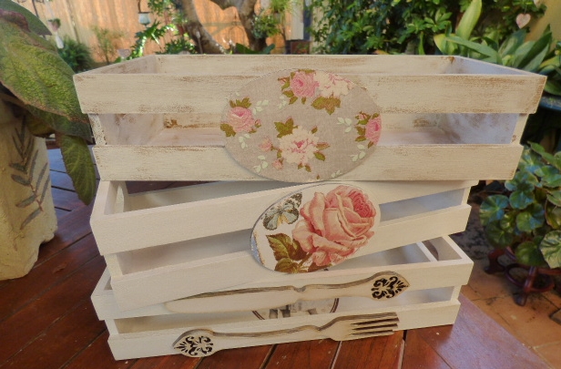 Cómo me gusta decorar este estilo de cajitas con lamas de madera en los costados. Una con cubiertos de madera y las otras dos, simplemente con una plaquita decorada.