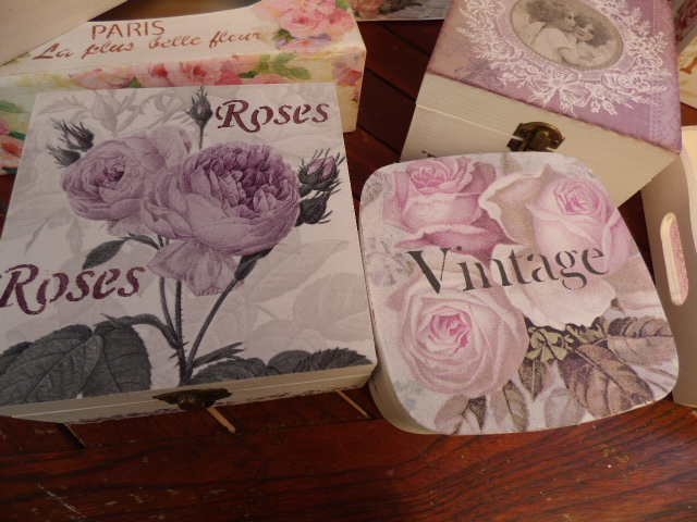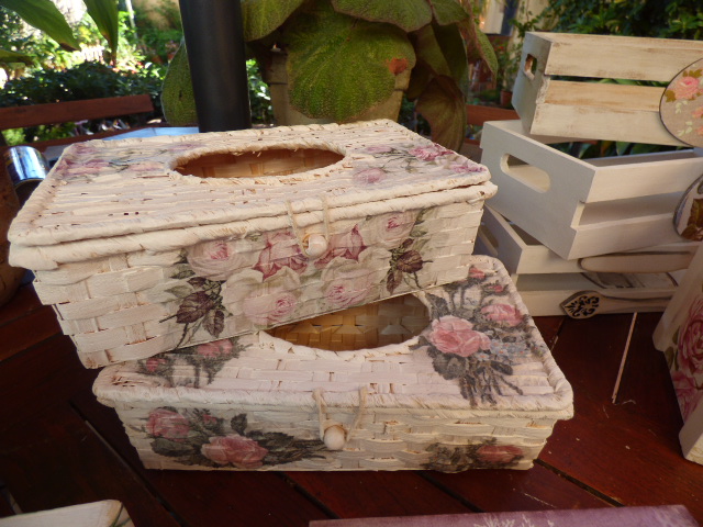 Estas cajitas de mimbre las encontré en una tienda que liquidaba todo...ahora me arrepiento de no haberme quedado más, porque quedan bonitas con decoupage de servilleta que se amolda a todos los recovecos del entramado del mimbre