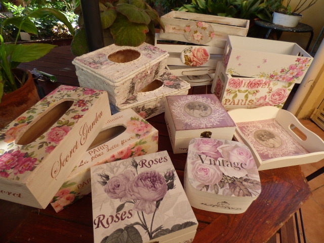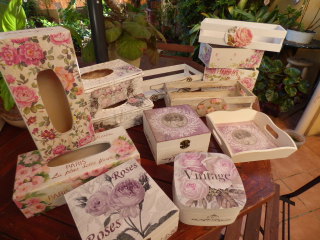 Estas cajitas, la verde y la azul se salen un poco de mi estilo...sobretodo la azul¡ Usar la servi de flores y fondo negro era todo un reto y la pintura de abajo no podía ser clara, así que la puse azul y aunque es muy diferente a lo que suelo hacer no me disgusta......es....otro estilo¡