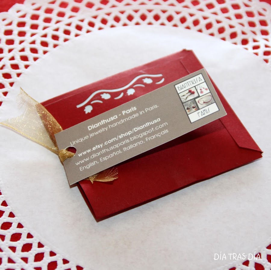 Y por último, este regalo, que era sorpresa, que he recibido esta misma mañana, y que venía de parte de Dianthusa Paris. Como he dicho con los anteriores, os recomiendo que visitéis también su blog y su tienda en Artesanio, porque Pilar tiene un exquisito gusto para realizar todo tipo de complementos, a cual más bonito ;-).
