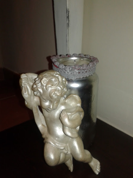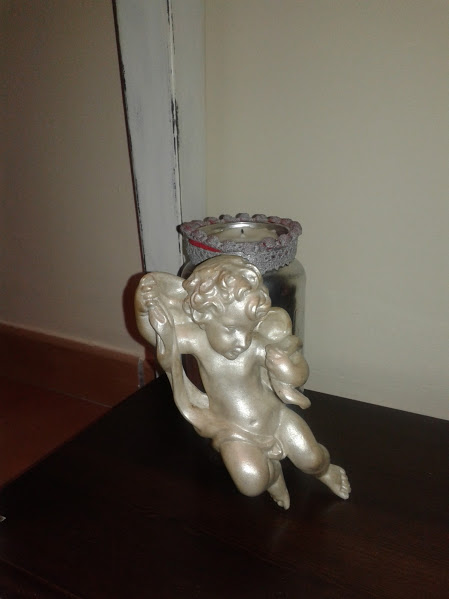 Y aquí mi angelito de marmolina , lo pinte plateado entero y lo pegue