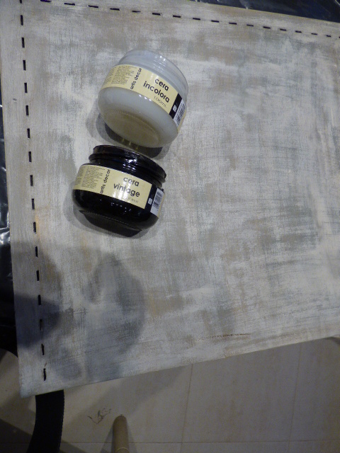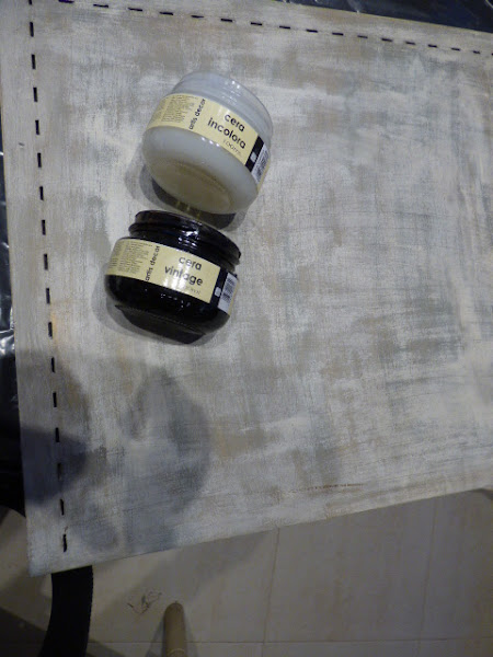 Una vez retirado el polvillo de la lija, cera transparente a todo y toques de la cera oscura, quitando y poniendo cera hasta que me gustó el resultado.