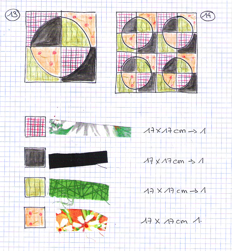 Bloque acabado (13). Os damos una muestra de cómo quedarían 4 bloques montados (14) y las medidas y muestras de las telas.
