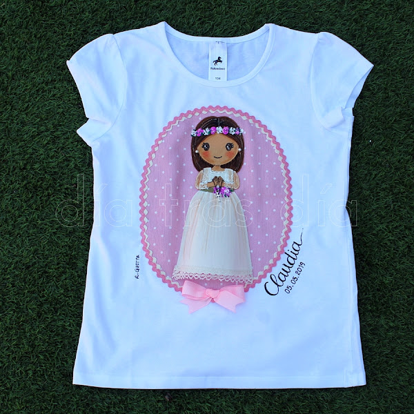 El modelo que le había gustado a Ester y a las mamis de las amigas de su hija fue el modelo “Medallón”. Me pidieron que fuese con el óvalo de tela en color rosa. Y me enviaron fotos de todas ellas con sus vestidos de Comunión para que pudiera hacer las camisetas personalizadas.