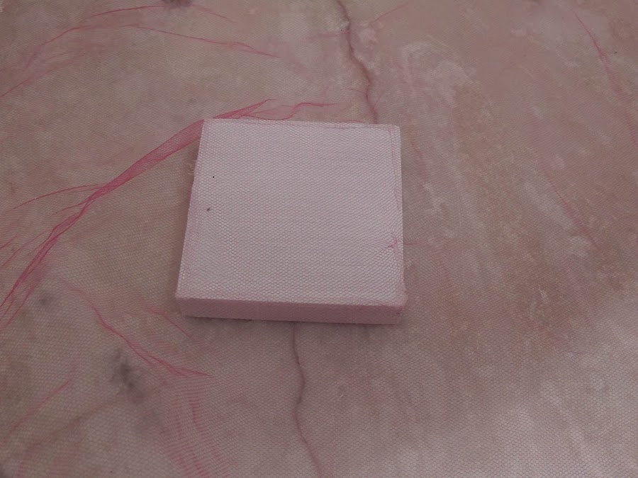 Por el lado de atrás de la cajita, pegamos un cuadrado de tul, que sea bastante mas grande que nuestra madera.