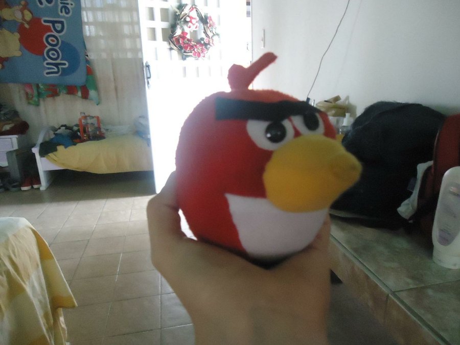 Este es Red, el más famoso de ellos. Está hecho con un retal de tela de cobija roja, su pico de franela amarilla y detalles en retales de varios colores. Sus ojos son botones negros. Para todos el material de relleno fue una almohada deformada, que estaba en desuso, en este caso es necesario separar las fibras antes de rellenar y evitar así los grumos que ya tiene el material por el uso.
