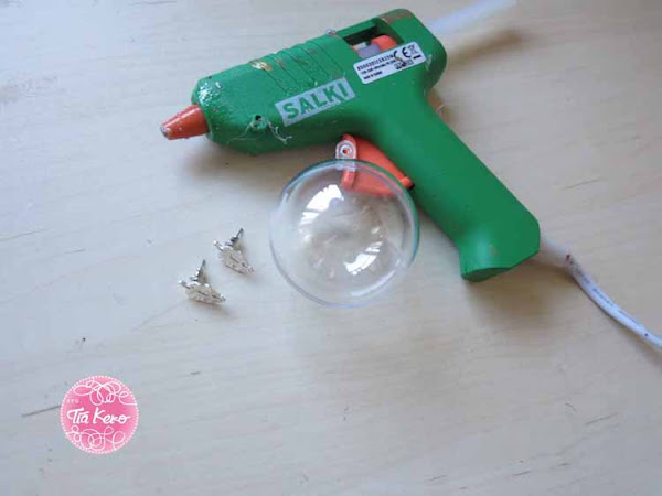 Cogemos una bola de Navidad de las de plástico que venden ahora para decorarla por dentro como tú quieras. En una de las dos mitades de la bola ponemos dos puntos de silicona caliente y a continuación colgamos cada pendiente de uno de esos puntos de silicona, veremos como se quedan pegados en pocos segundos.